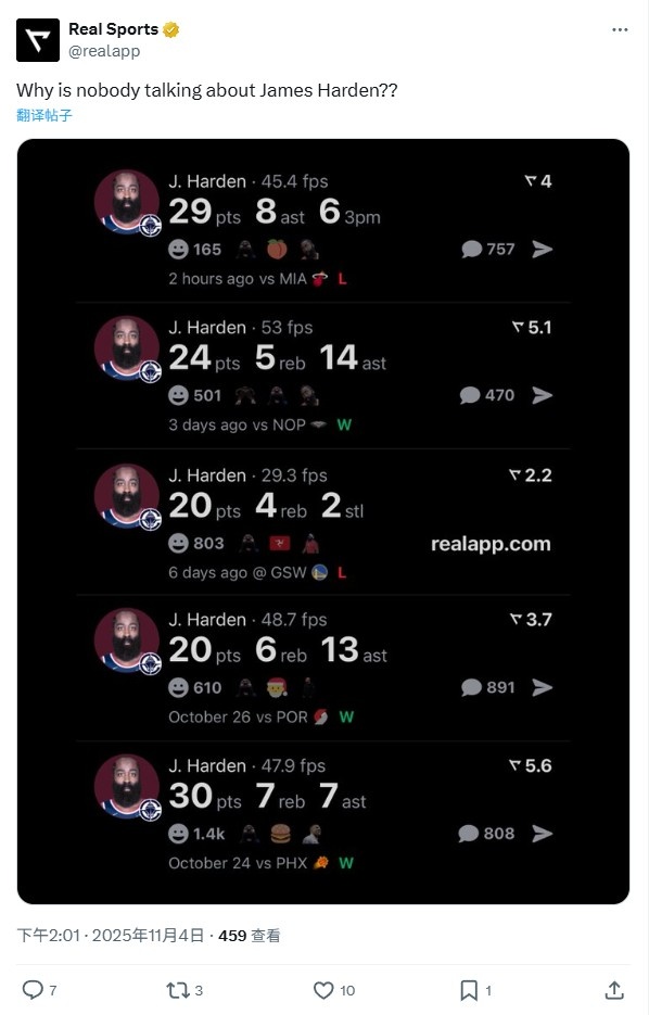 Data American media Real Sports posted Harden's statistics in the past five games, all of which scored 20+ points, and wrote: "Why is no one talking about James Harden??"