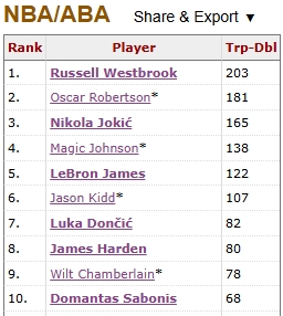 Jokic has scored 166 triple-doubles in his career so far, temporarily ranking third in history. The top two are Westbrook (203 times) and Big O (181 times).