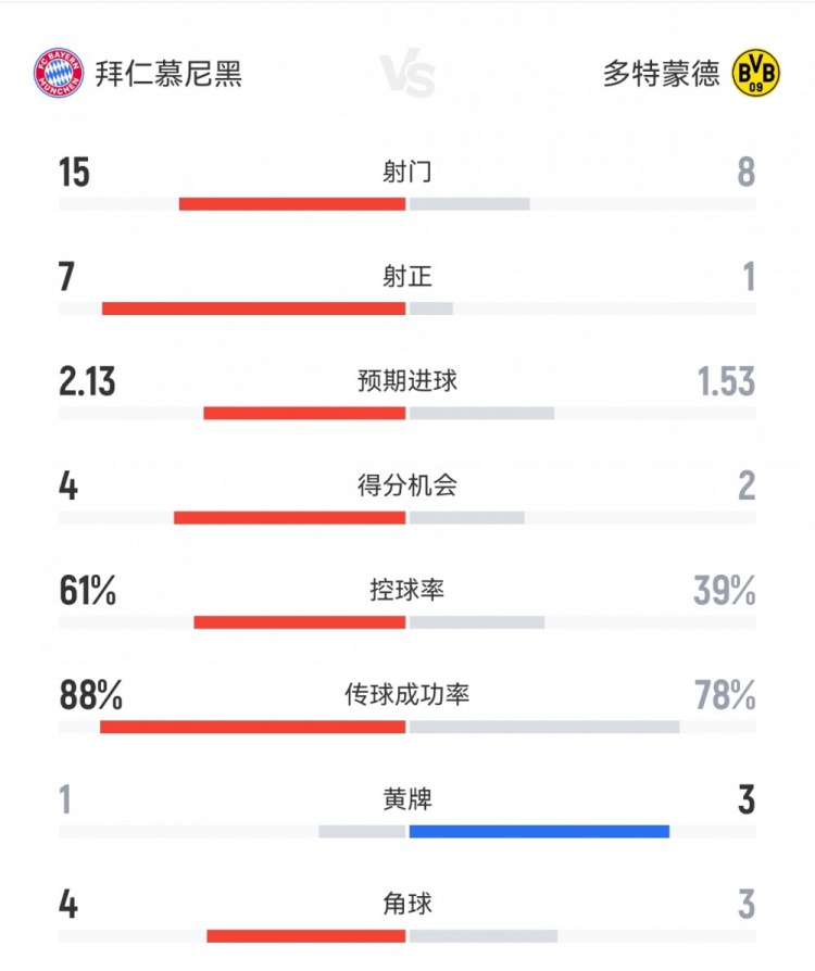 The focus of this round of Bundesliga is Bayern 2-1 Dortmund at home. The comparison of the key statistics of the two sides is as follows↓ (Home team Bayern is in front)