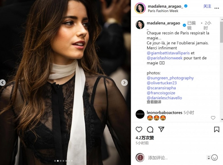 Madalena posted several photos of her attending Paris Fashion Week and wrote: "There is magic everywhere in every corner of Paris, and I will never forget this day."