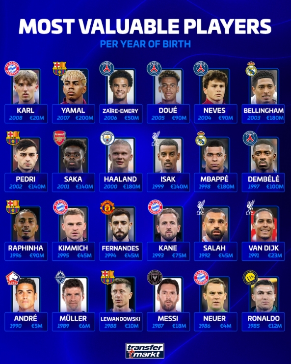 Dezhuan has compiled statistics on the most valuable players of each age group. Among them, Messi, Cristiano Ronaldo, Haaland, Mbappe and others are on the list.