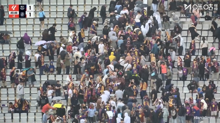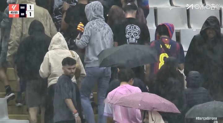 Heavy rain fell suddenly during the first half stoppage time of Barcelona vs Girona, and the audience left the field to take shelter from the rain.