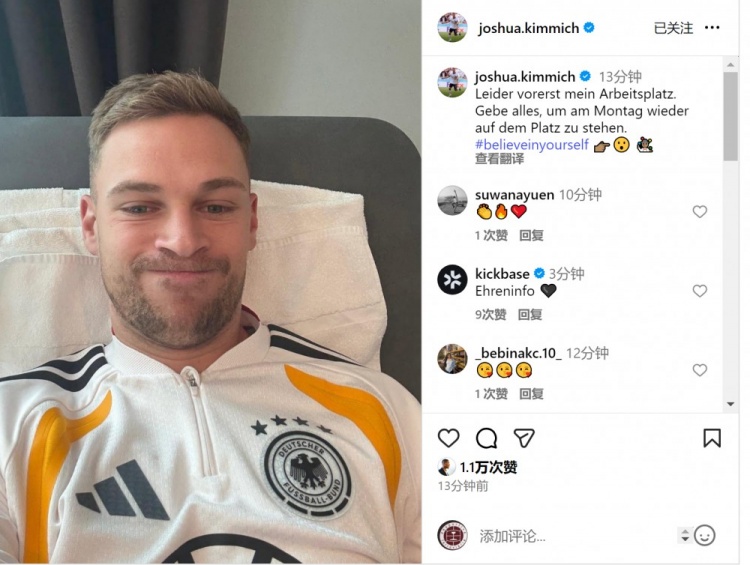 Kimmich posted a photo of himself in the medical room on social media and wrote: "Unfortunately, this has temporarily become my workplace. I will try my best to return to the game next Monday (against Slovakia)."
