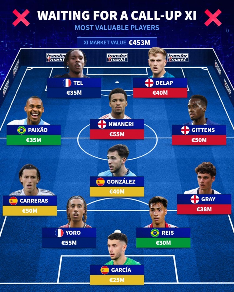 The German transfer market lists the most valuable lineup that has missed the national team, including Nwaneri, Carreras, and Yoro.