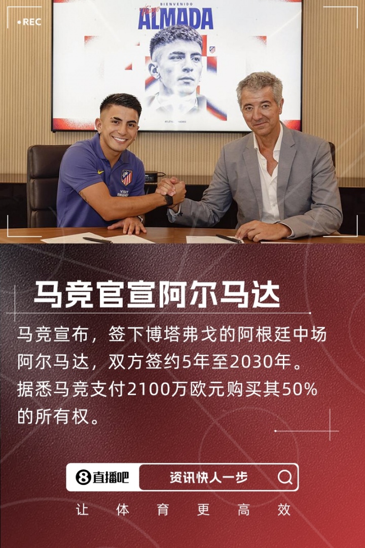 Official news, Atletico Madrid signs 24-year-old Argentine midfielder Almada. The two sides have signed a contract for 5 years. According to previous reports, Atletico Madrid will pay 21 million euros to buy 50% ownership for Almada.