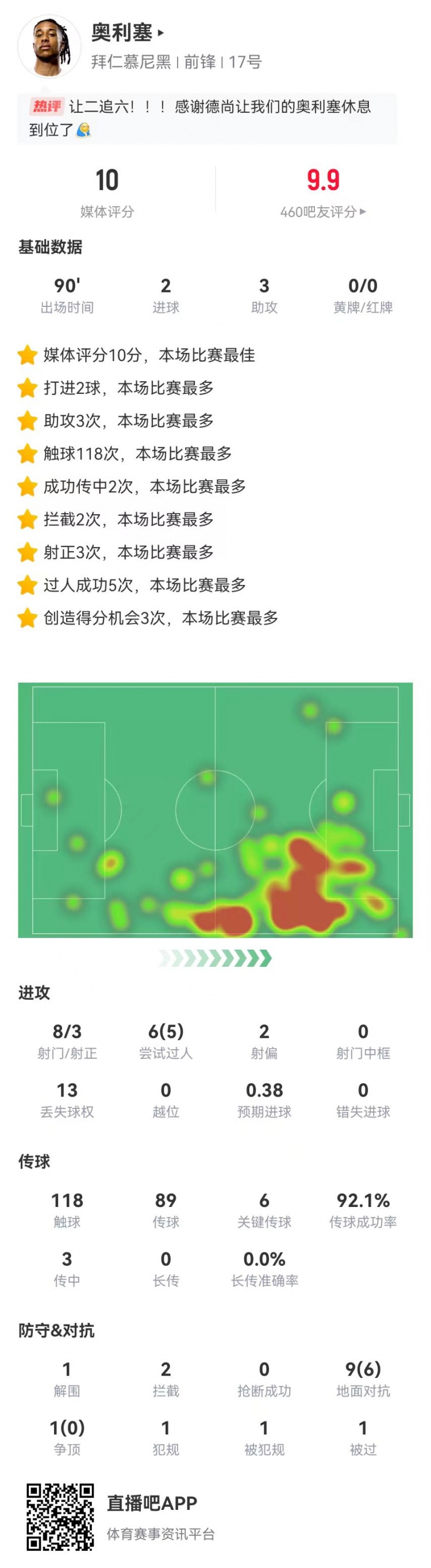 Bayern reversed Freiburg 6-2 at home in this round of Bundesliga. Olise's statistics for this game are as follows: