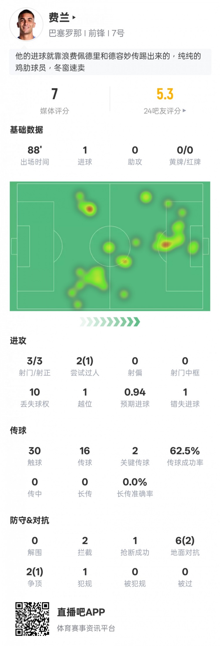 In the 11th round of La Liga, Barcelona faced Elche at home. Ferran Torres started the game and contributed 1 goal, sent 2 key passes, 1 successful dribble, and 1 missed goal opportunity, with a rating of 7.0.