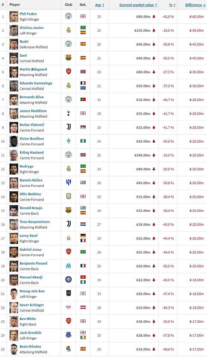 1. Foden (Manchester City): Currently worth 80 million euros, his value dropped by 60 million euros, a decrease of 42.9%