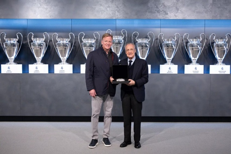 Today, Real Madrid Chairman Florentino Perez and NFL Commissioner Roger Goodell met and exchanged gifts. Florentino was presented with a football, and Goodell was presented with the Real Madrid No. 1 jersey and a Bernabeu model.
