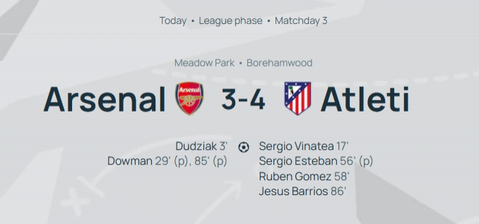 In the third round of the UEFA Youth League, Arsenal U19 lost to Atletico Madrid U19 with a score of 3-4. 15-year-old Dauman started the game and scored two penalty kicks but could not prevent the team from losing.