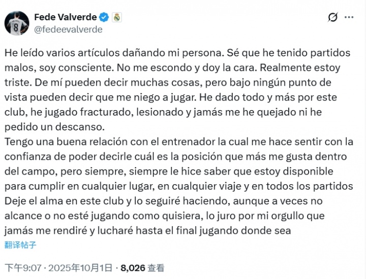 Valverde posted on social media, responding to previous media reports that he refused to play. He said that he had a good relationship with the coach and was willing to give everything for Real Madrid.